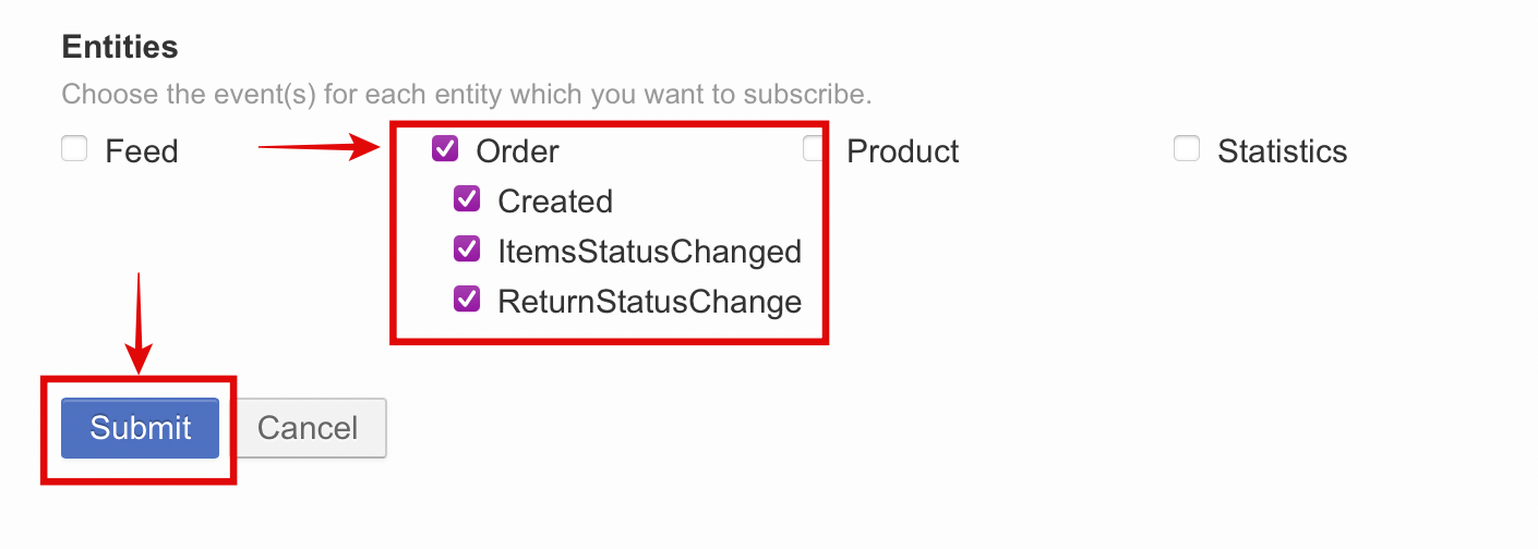 Checklist the Order Entities & Click Submit to connect to your store and manage order and product.