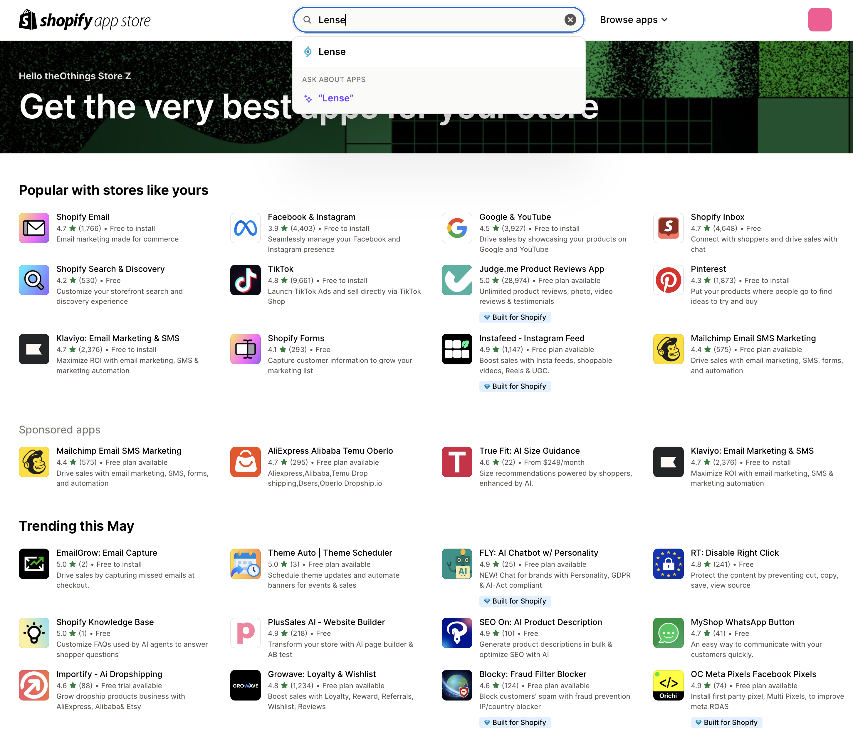 Install Lense app in Shopify Apps Store