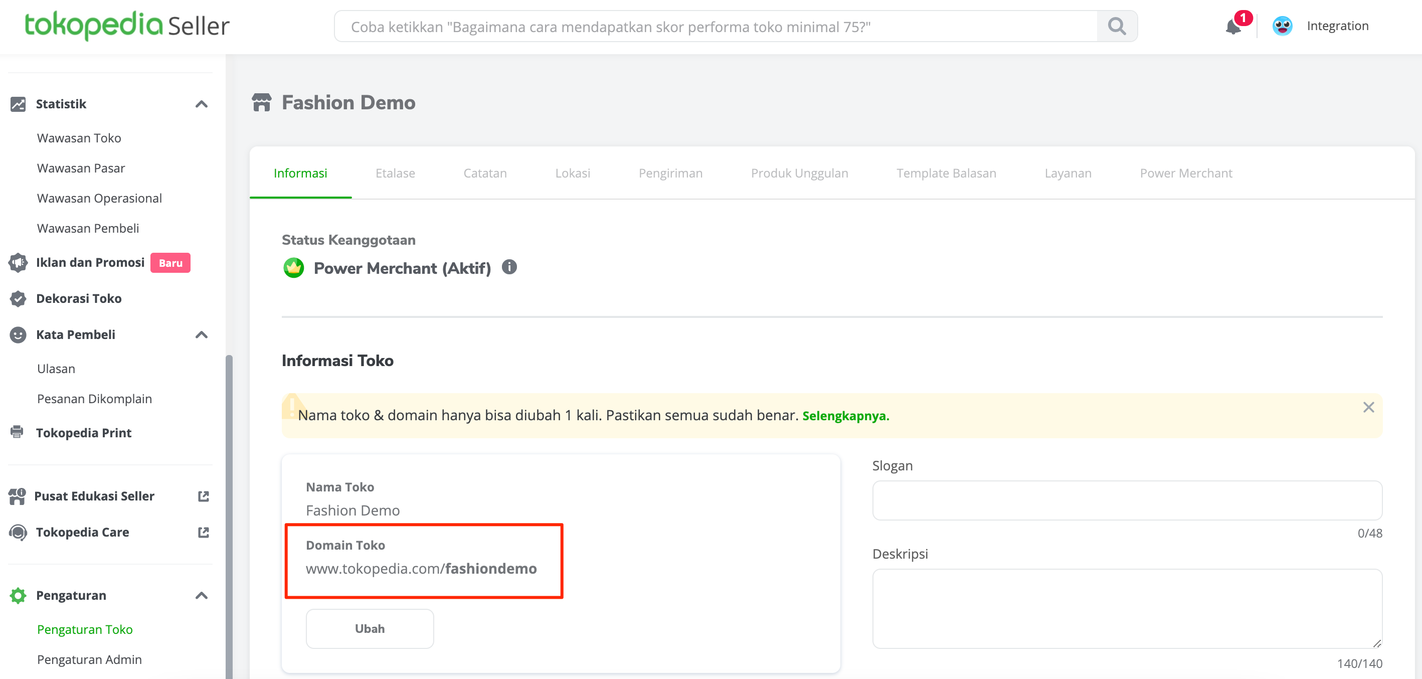Please inform your shop domain. You can find it in Tokopedia Seller, menu Store Setting.